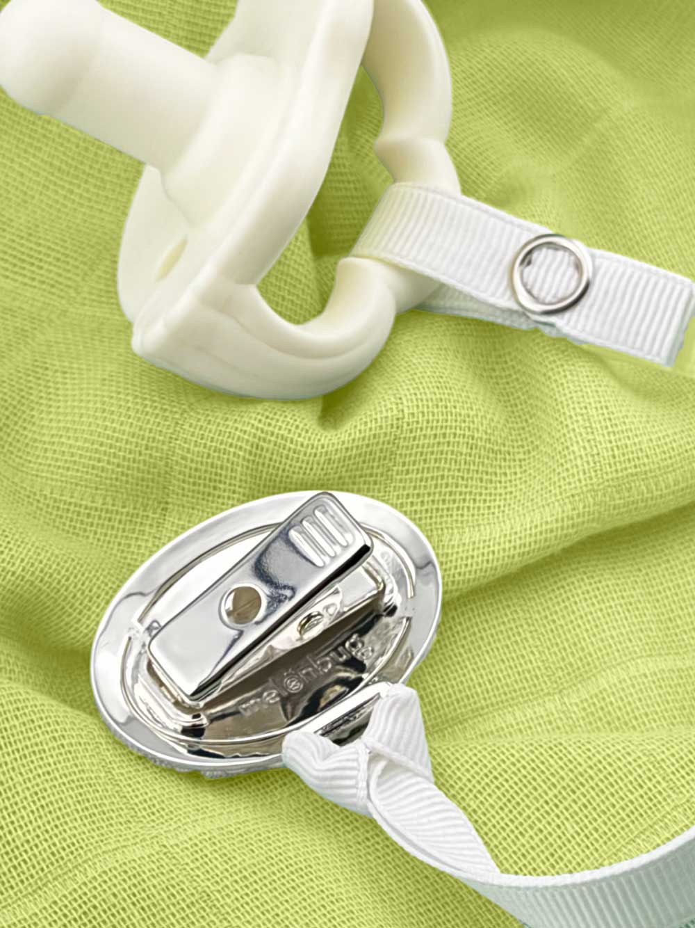 Our Royal Silver Pacifier Clips blend elegance with functionality for your little one. With bright 925 silver plating and a sturdy spring-clip to attach securely to swaddles, diaper bags, or clothing, our clips are designed to keep pacifiers off the ground while adding a regal flair to your baby's ensemble.