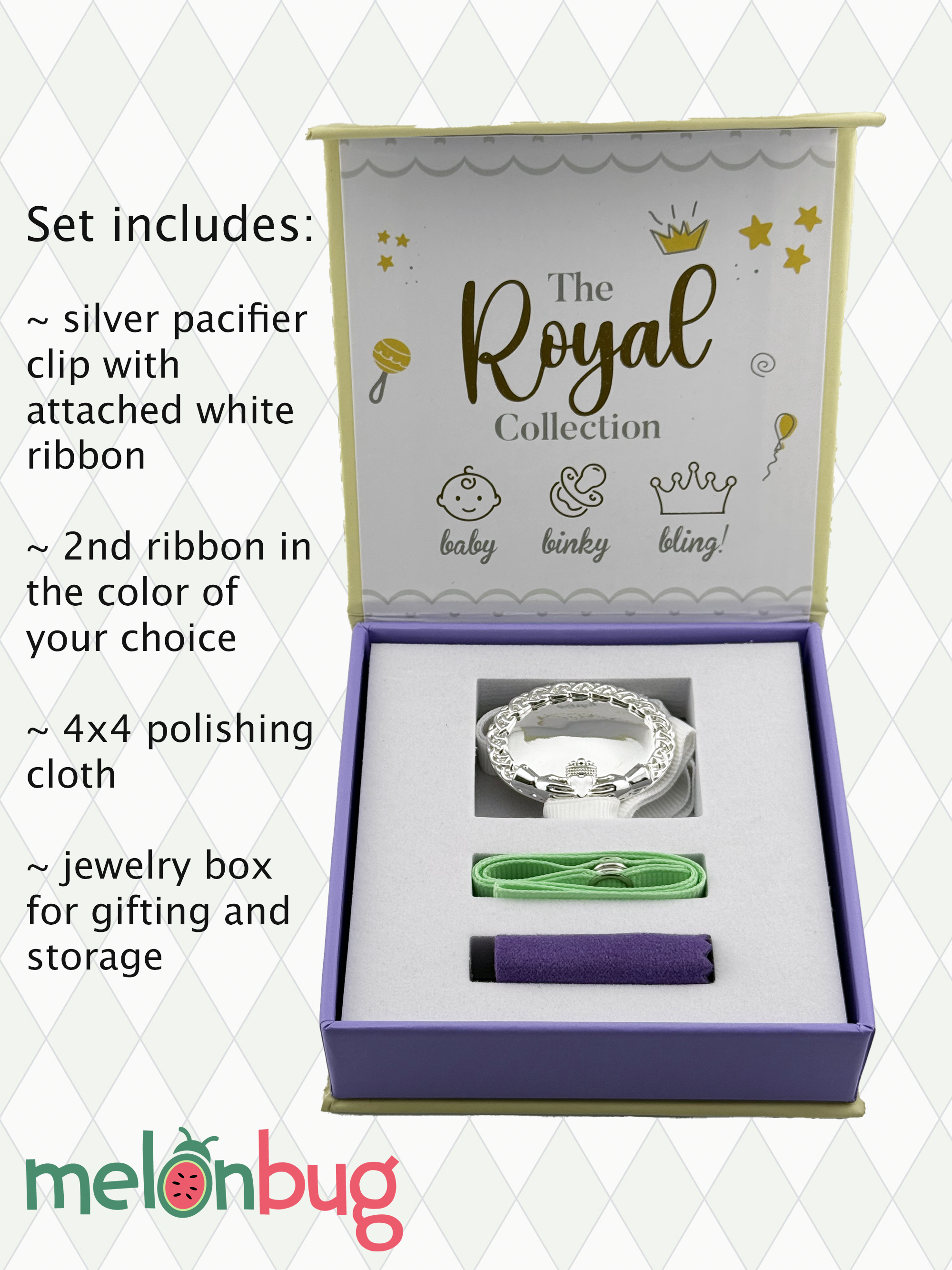 Our Royal Silver Pacifier Clips are a delightful Melonbug original! First crafted in the 1990s, they were reimagined in 2024 with a charming royal theme and a nod to the British royal family. This fresh collection of designs is the result of a creative partnership between Melonbug owner Julie Carton (St. Louis, MO) and talented jewelry designer Tery Saber (Los Angeles, CA), combining their artistic visions to create a truly unique and special heirloom baby gift.