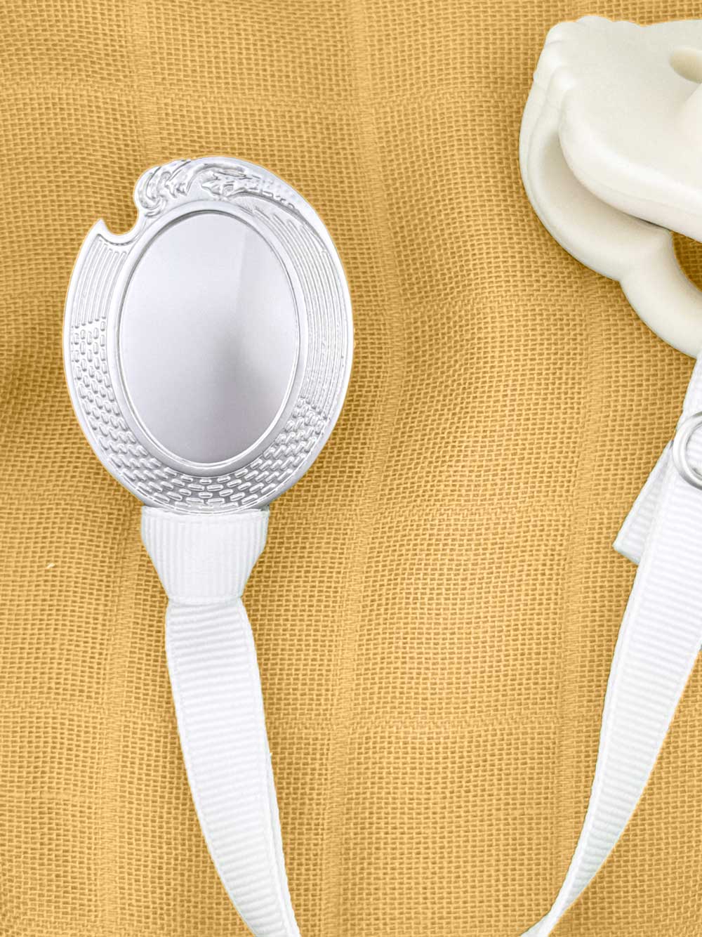 Our Royal Silver Pacifier Clips blend elegance with functionality for your little one. With bright 925 silver plating and a sturdy spring-clip to attach securely to swaddles, diaper bags, or clothing, our clips are designed to keep pacifiers off the ground while adding a regal flair to your baby's ensemble.
