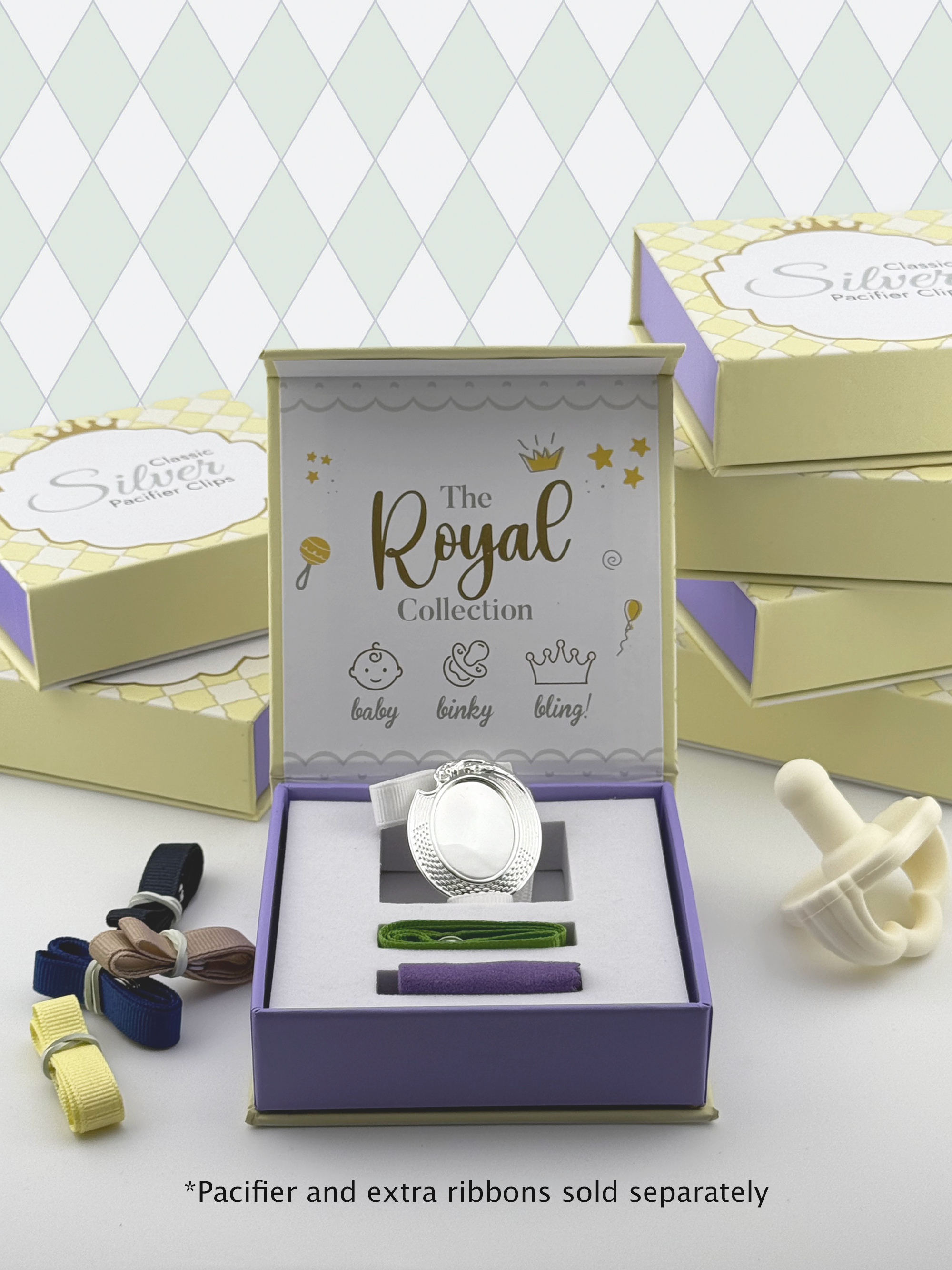 Each Royal Silver Pacifier Clip is not just a practical accessory, but also a treasured keepsake! With the option for custom engraving, you can make it uniquely special for your little prince or princess.