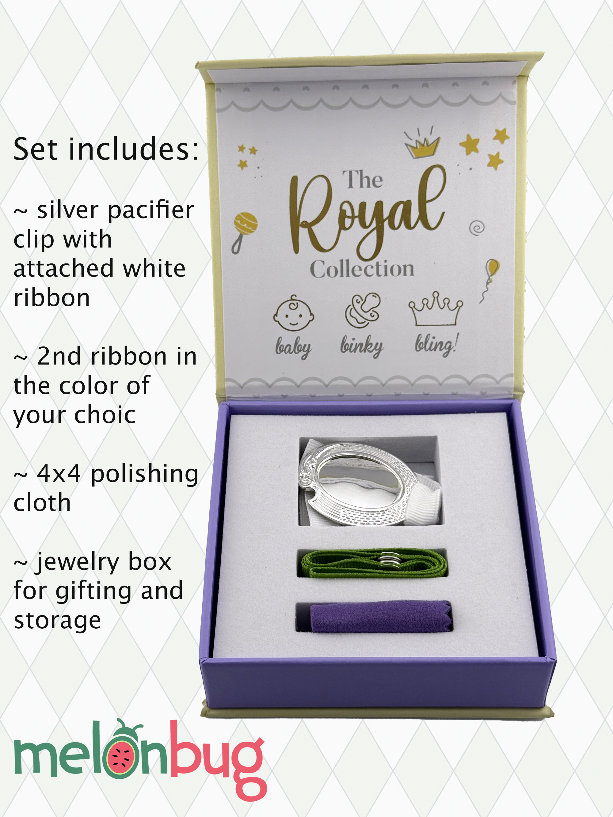 Our Royal Silver Pacifier Clips are a delightful Melonbug original! First crafted in the 1990s, they were reimagined in 2024 with a charming royal theme and a nod to the British royal family. This fresh collection of designs is the result of a creative partnership between Melonbug owner Julie Carton (St. Louis, MO) and talented jewelry designer Tery Saber (Los Angeles, CA), combining their artistic visions to create a truly unique and special heirloom baby gift.